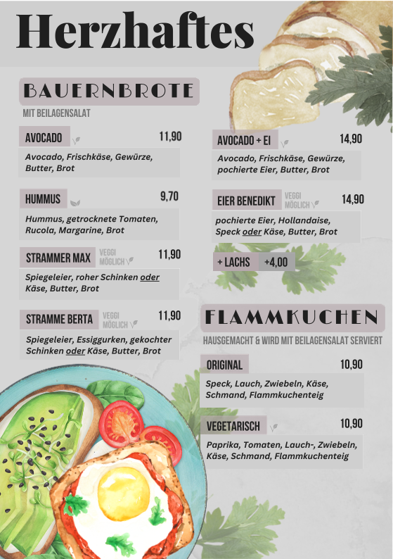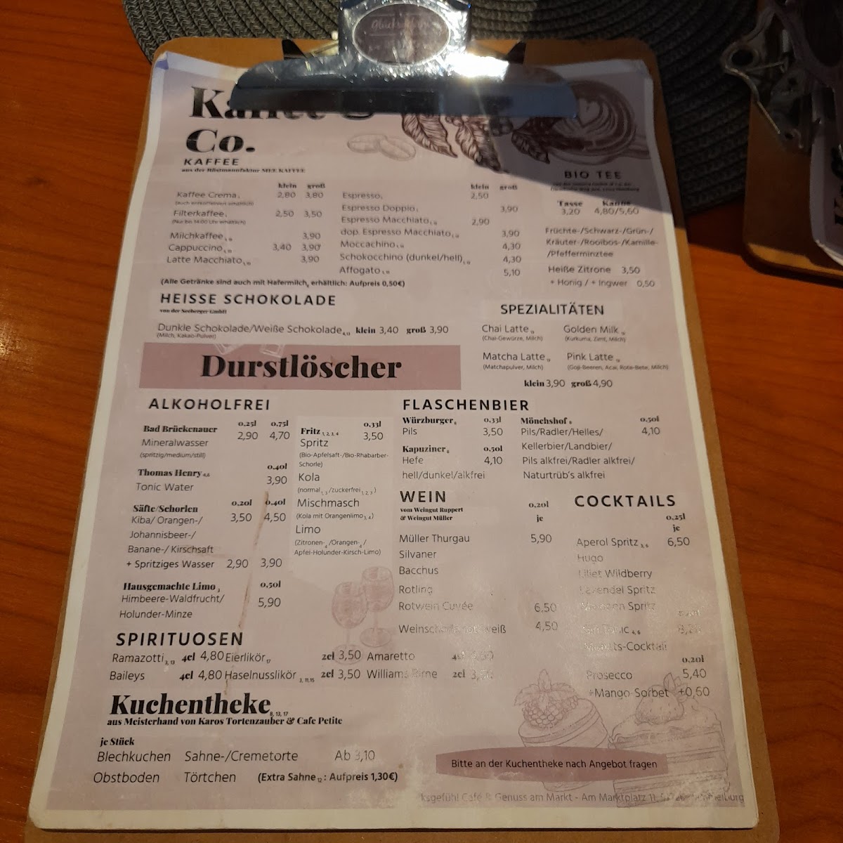 The menu at Glücksgefühl - Café & Genuss am Markt offers a variety of options suitable for breakfast, coffee breaks, and light meals. Visitors can find a selection of breakfast items including dishes such as scrambled eggs, omelettes, avocado toast, and croissants. The café also serves a range of main courses featuring traditional and regional specialties like Rinderbraten (roast beef), Wildschweingulasch (wild boar goulash), Paprika Gulasch, Sauerbraten, and Fisch Mediterran.
