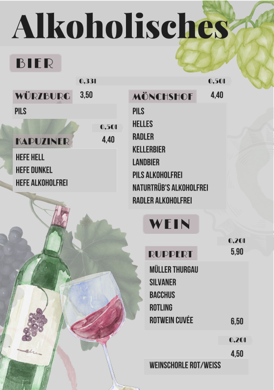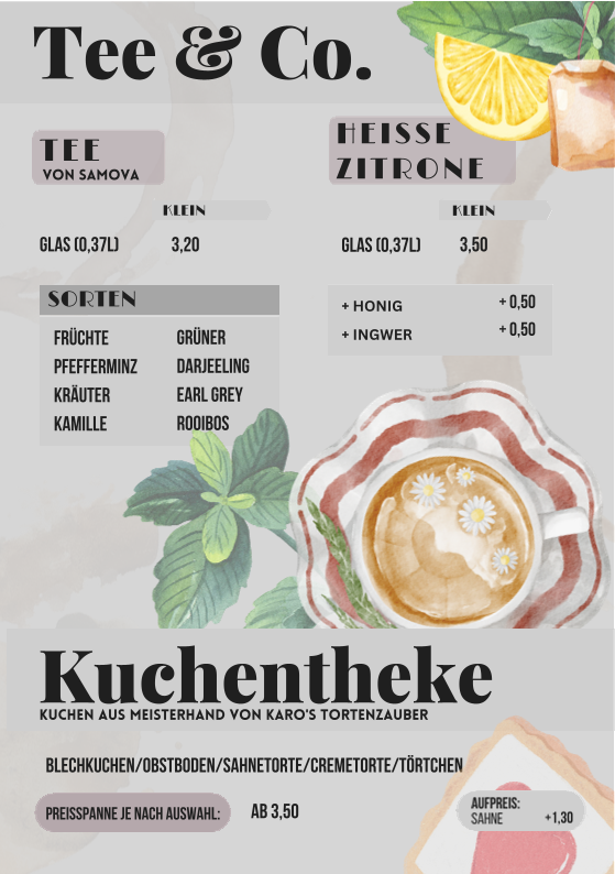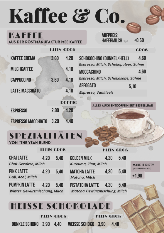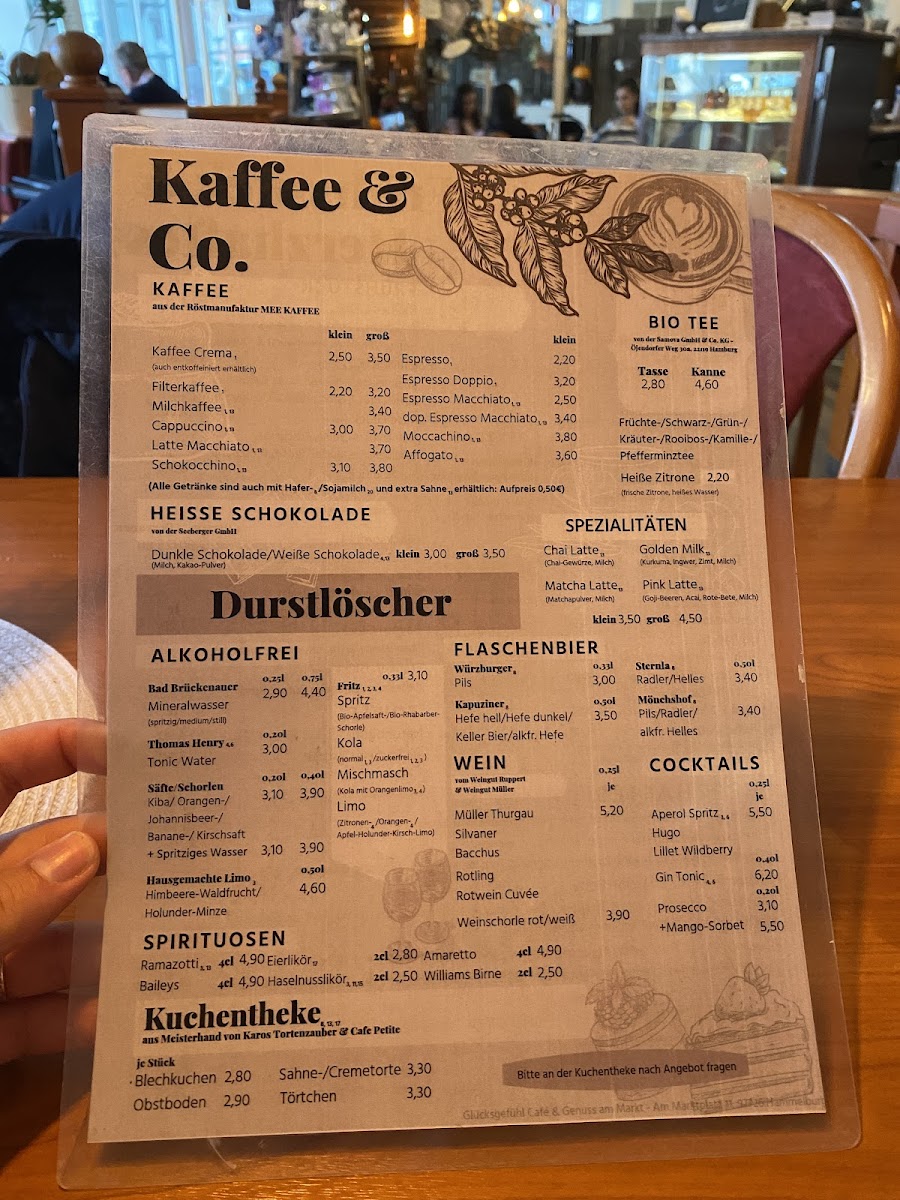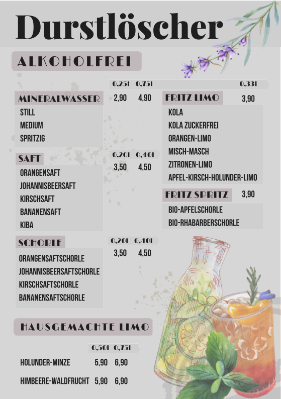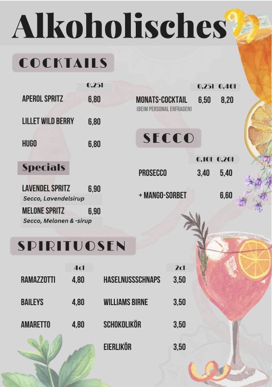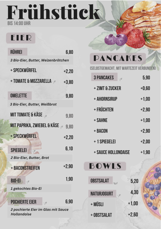 For lighter fare and snacks, choices include various torted cakes, Käsekuchen (cheesecake), Dinkelapfelkuchen (spelt apple cake), and fresh fruit salads served with yogurt. The drink selection is rounded out by hot beverages such as coffee and hot chocolate as well as refreshing options like Melone Spritz.